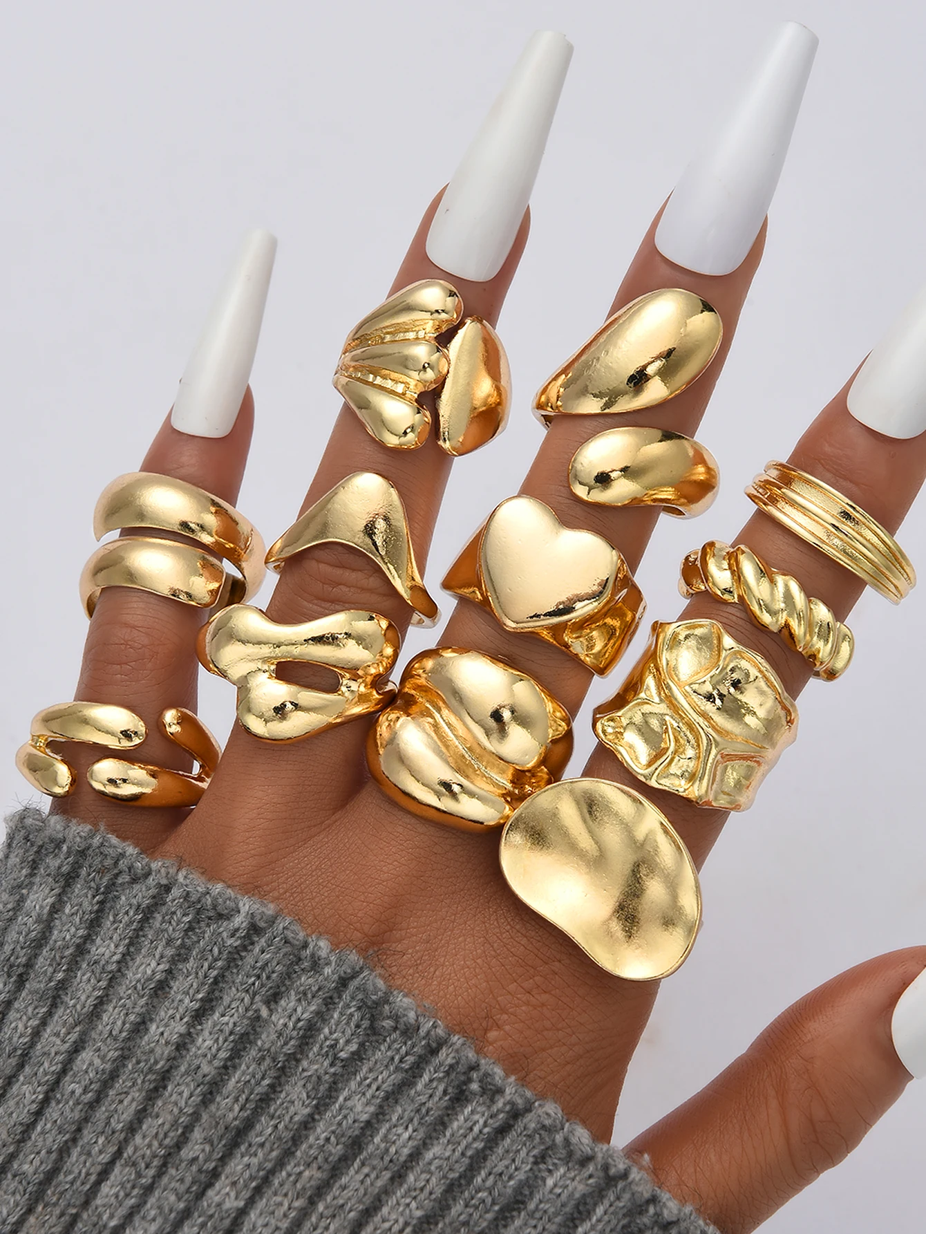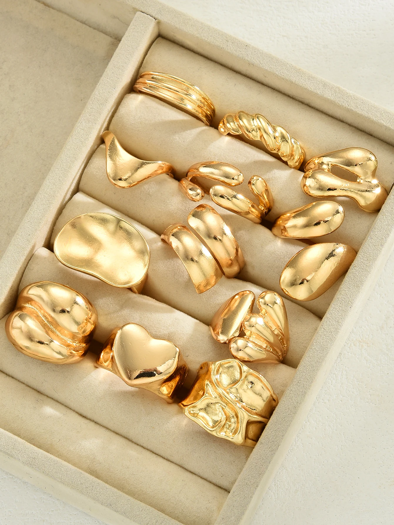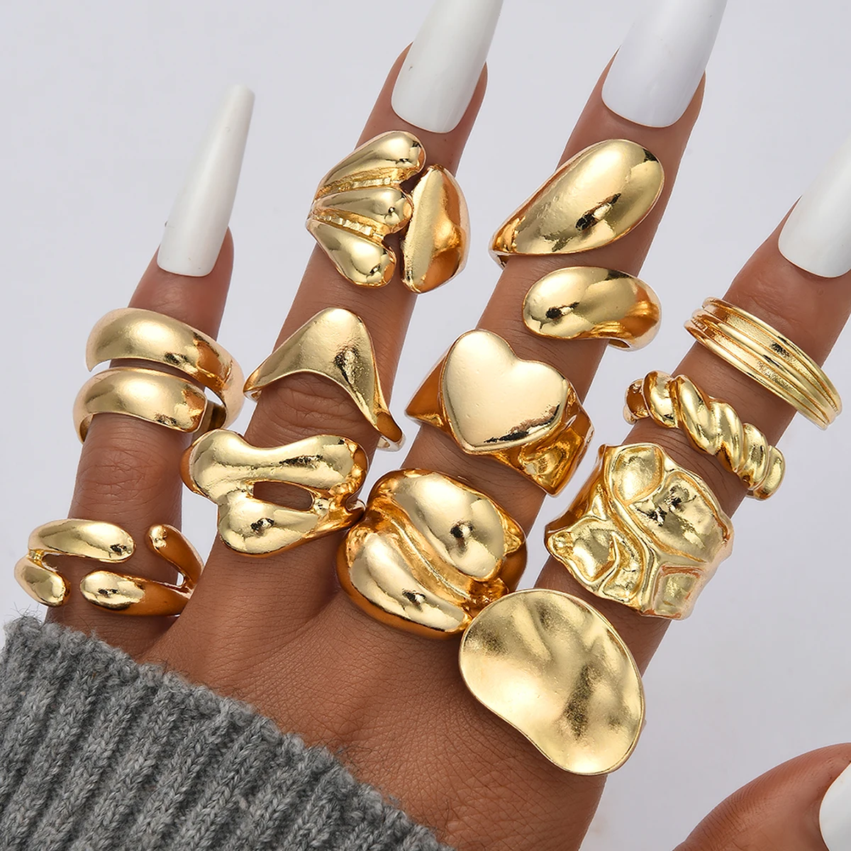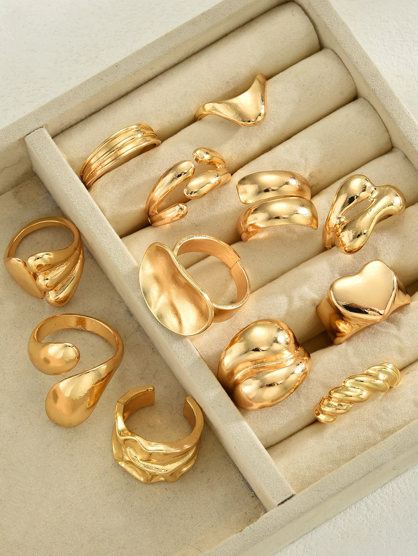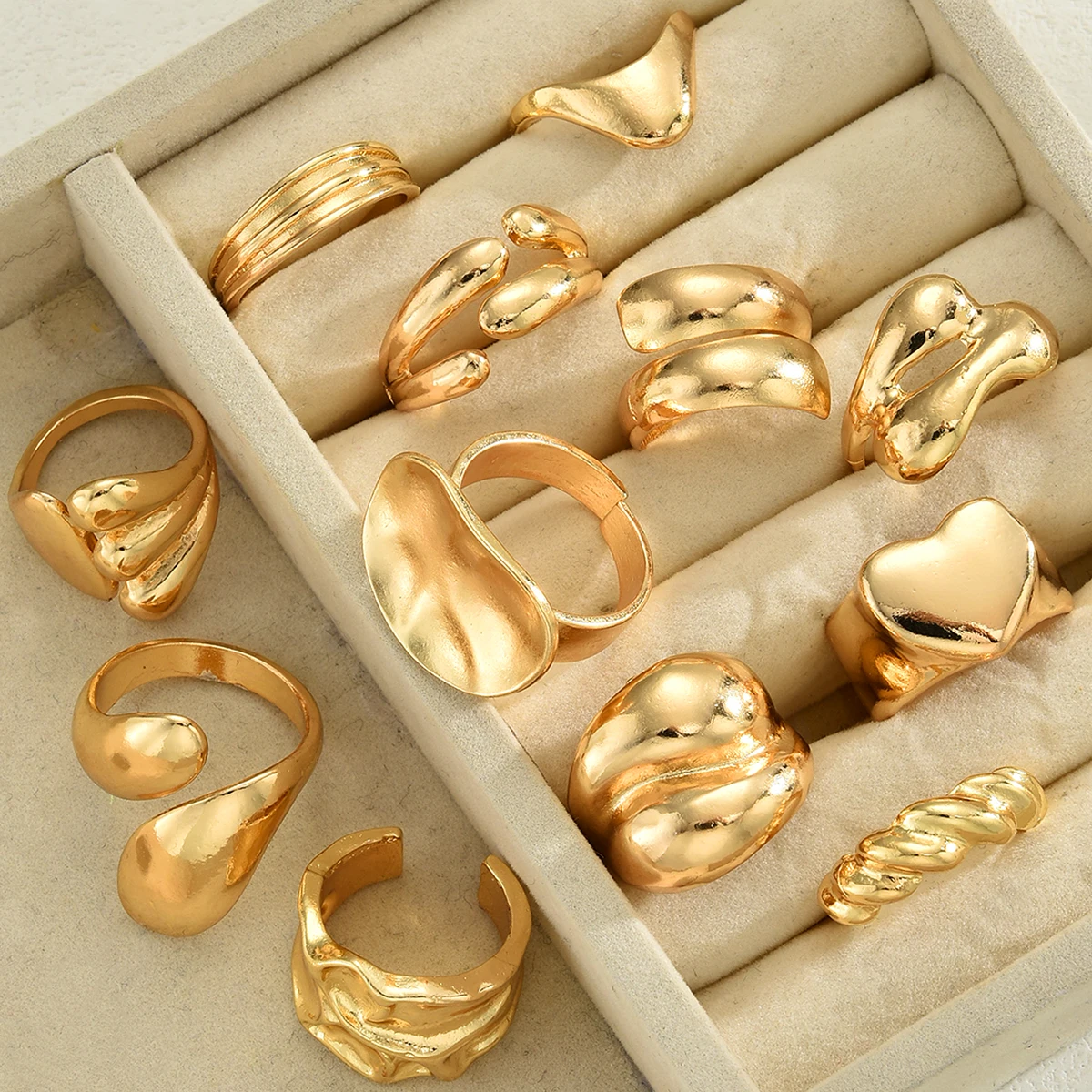12Pcs Gold Color Lava Texture Ring Set For Women Chunky Statement Irregular Heart Teardrop Stackable Rings Minimalist Jewelry