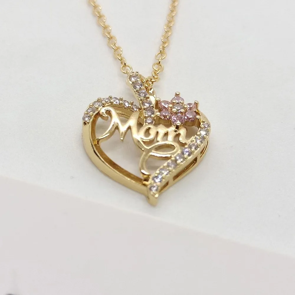 This exquisitely crafted mom heart necklace merges timeless charm with delicate sparkle—ideal for expressing love to the special mom in your life. Featuring a polished gold-plated finish, the open heart frame is edged with shimmering clear cubic zirconia, while a cluster of soft pink stones adds a romantic pop of color front and center. The cursive "Mom" detail is elegantly woven into the heart design, turning this into a sentimental yet fashionable piece.
