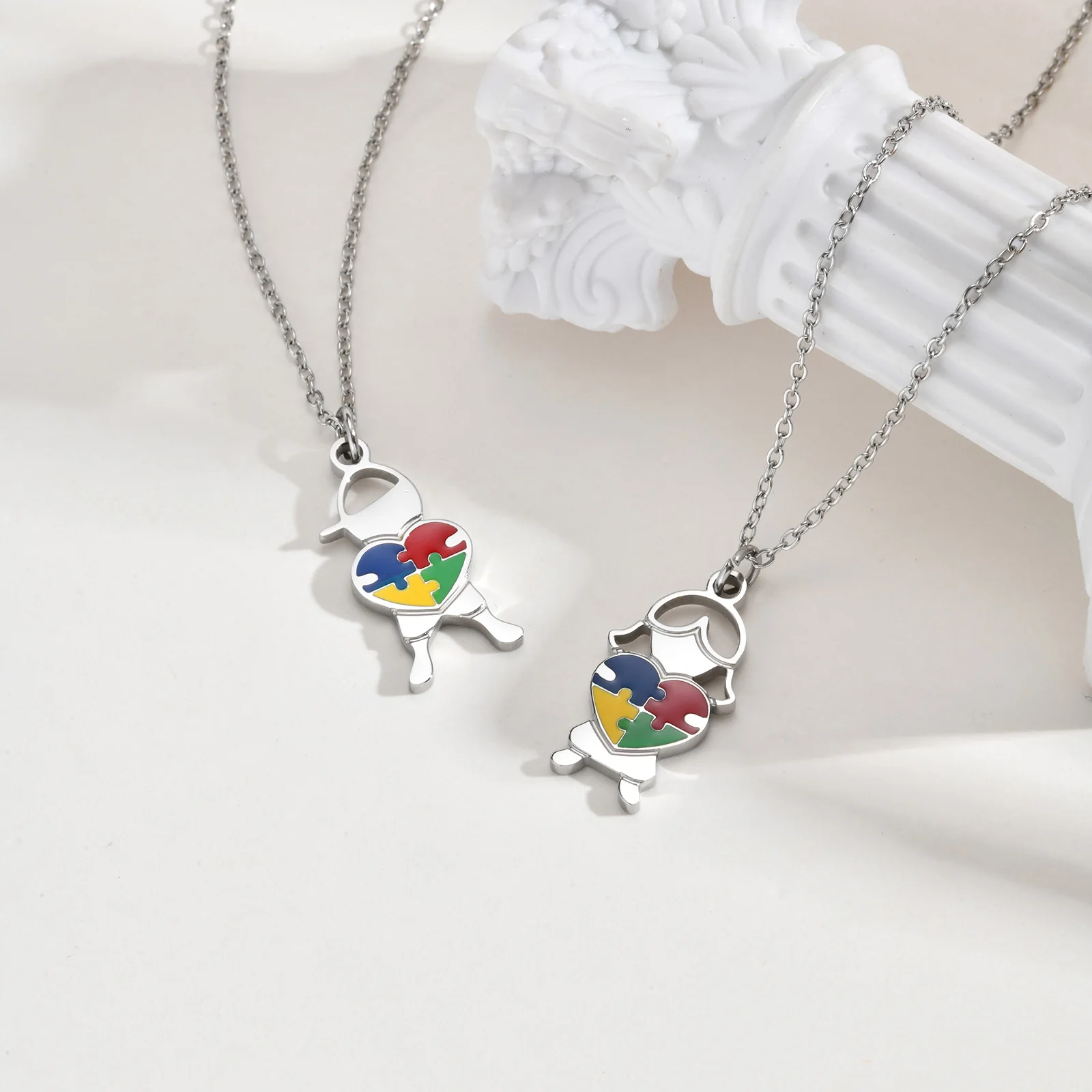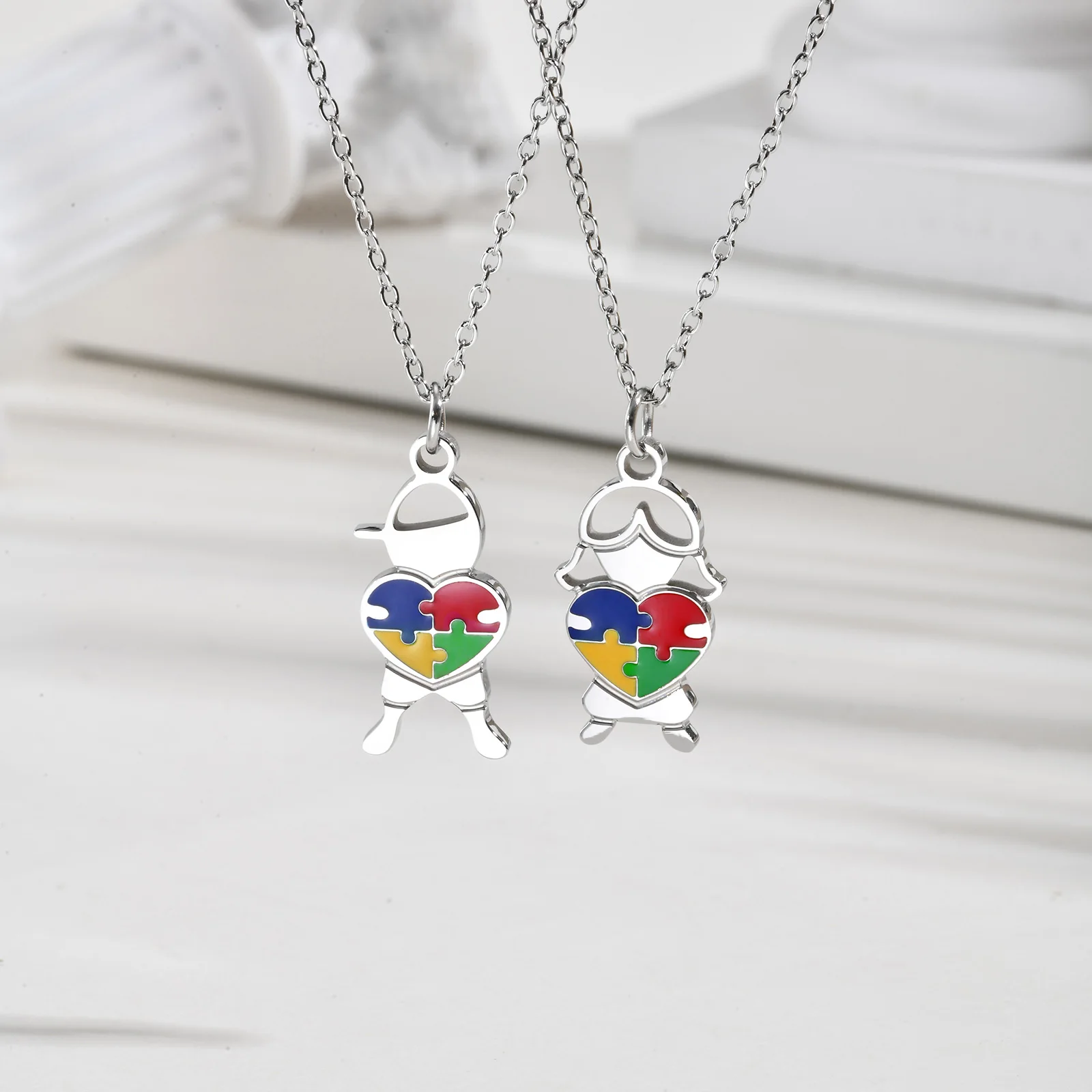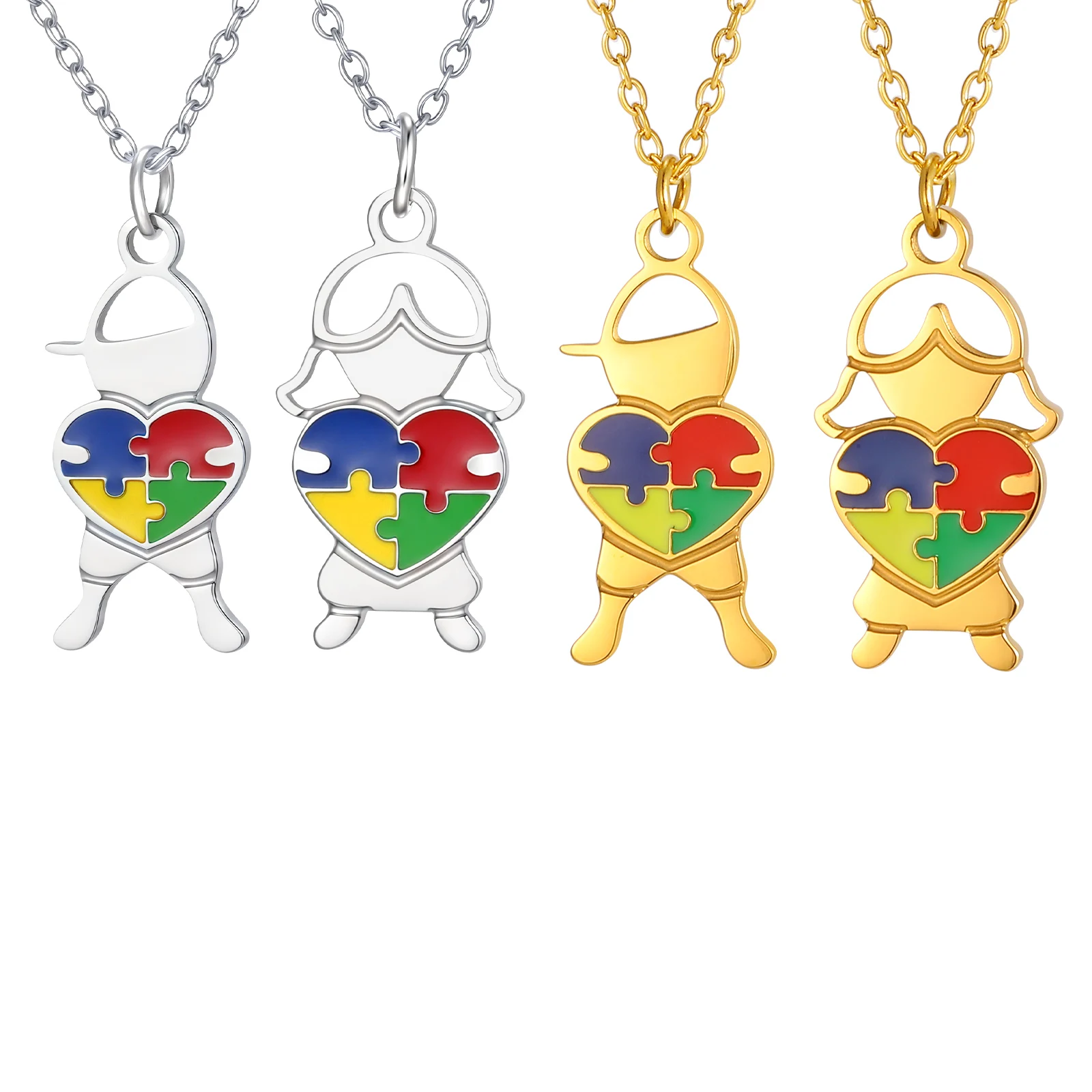 Stainless Steel Jewelry Heart Puzzle Boy&Girl Shaped Pendant Necklace Autism Awareness Silver Color Chain Necklace for Women
