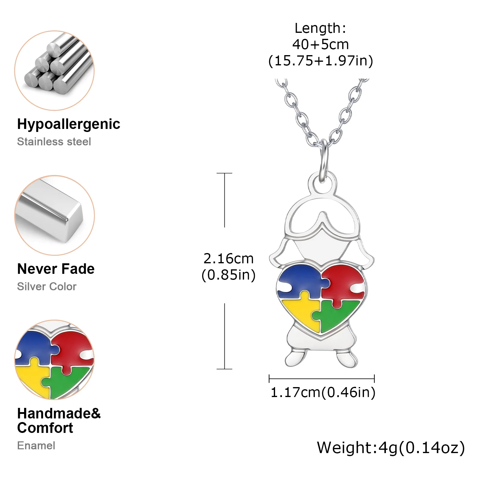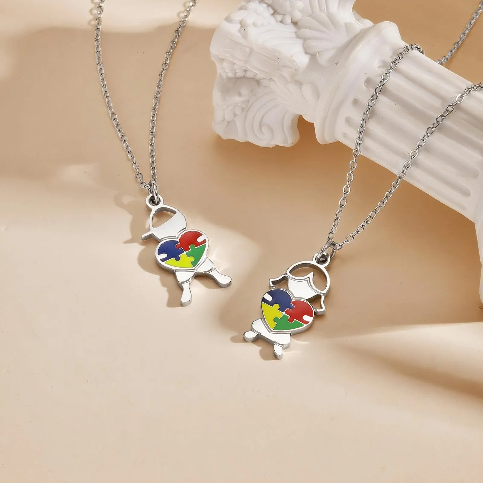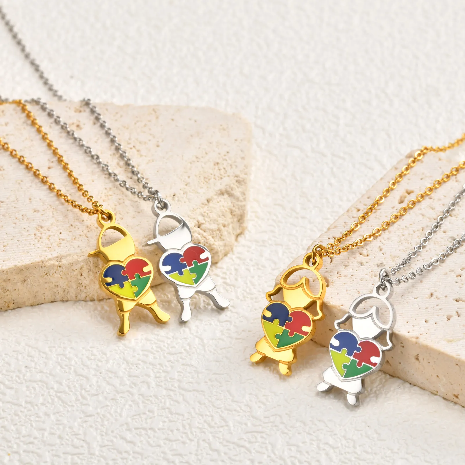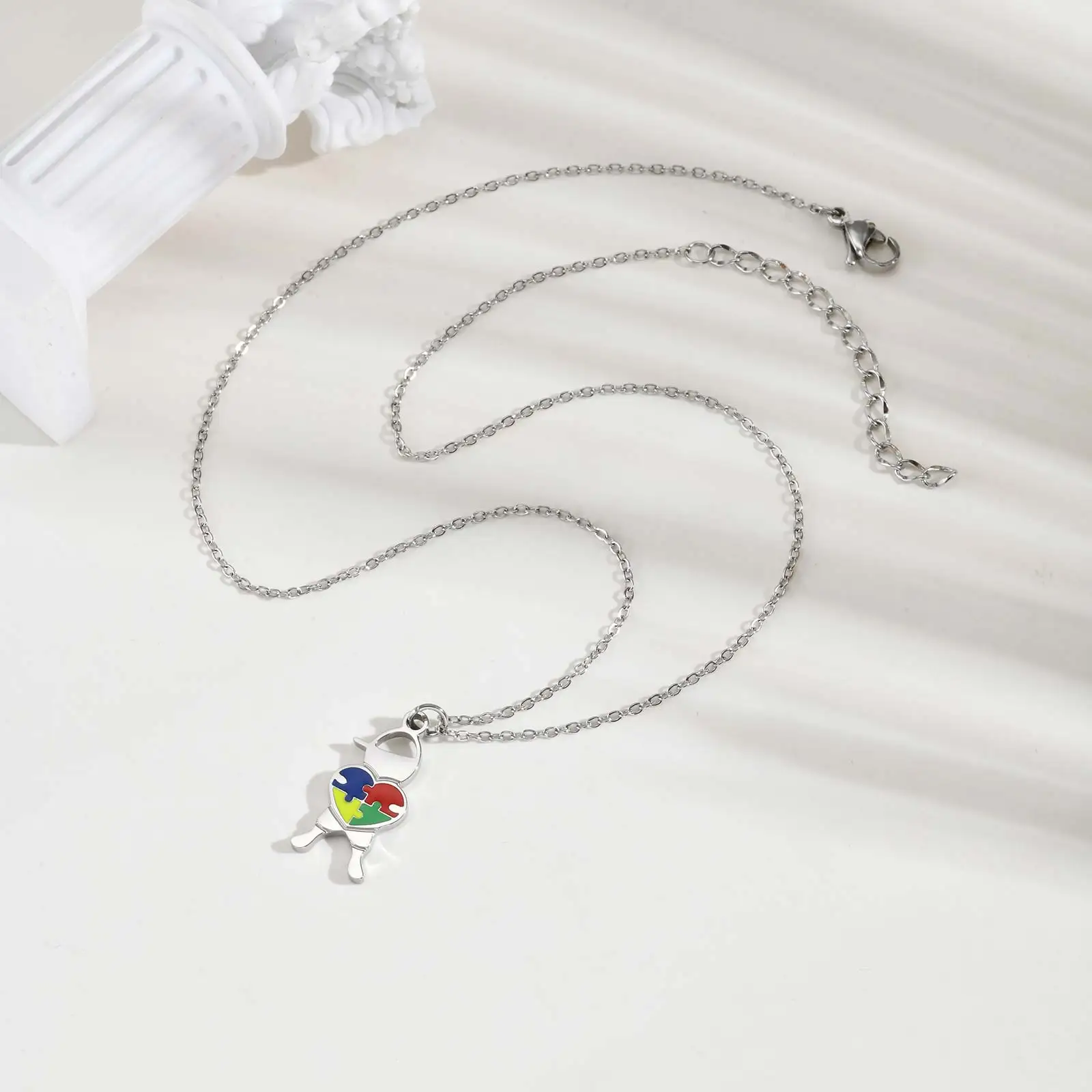 Stainless Steel Jewelry Heart Puzzle Boy&Girl Shaped Pendant Necklace Autism Awareness Silver Color Chain Necklace for Women